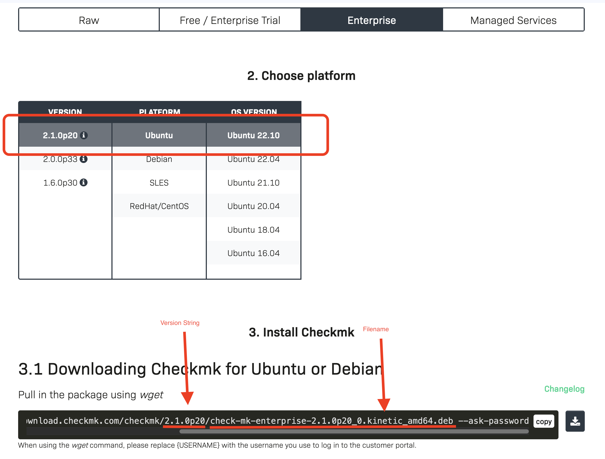 Here you set the Target Version you want to use. The needed information can be found on the Checkmk Download Page: