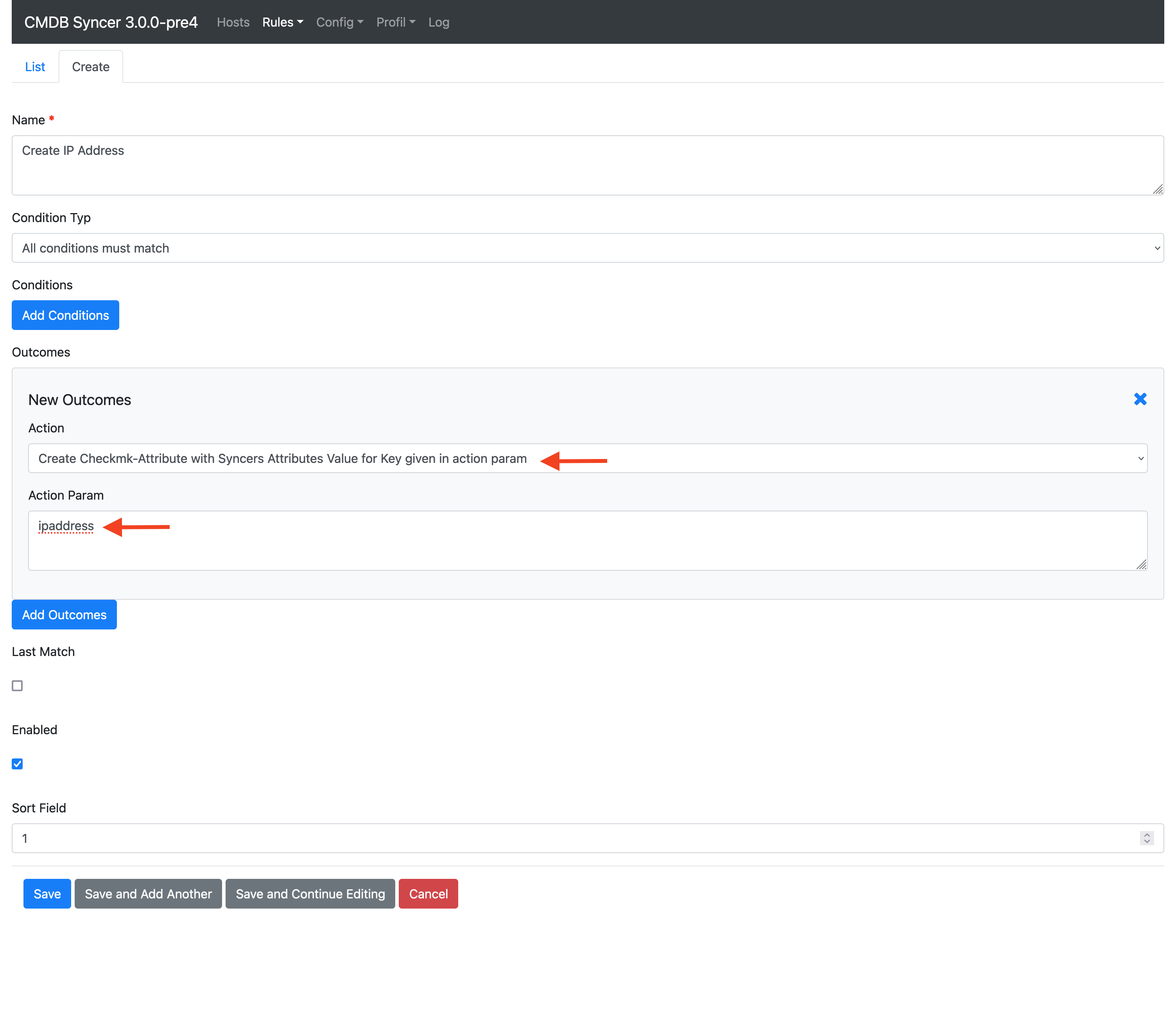 To use an existing Syncer Attribute, which either already have the correct name ipaddress, or is rewritten to this name, use the "Create Checkmk-Attribute" Action like this: