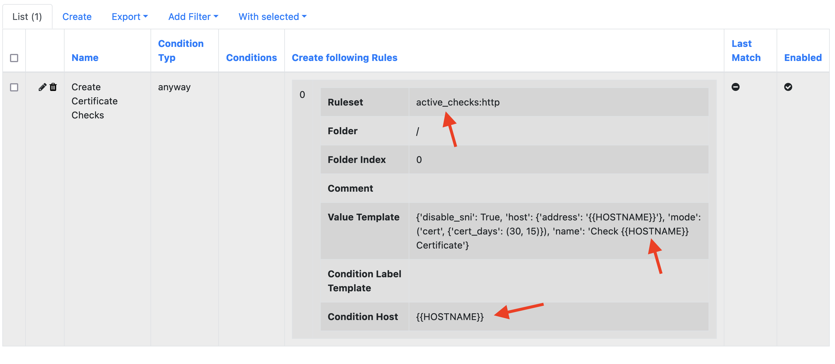 Most likely, in this example, the condition_label_template stays empty and you just place {{HOSTNAME}} as Condition host. Technically, you can add more than one Hostname comma separated, if this makes sense. Since this Field also supports Jinja, you can do all Jinja Magic with your Labels, which result in a Comma separated list.
