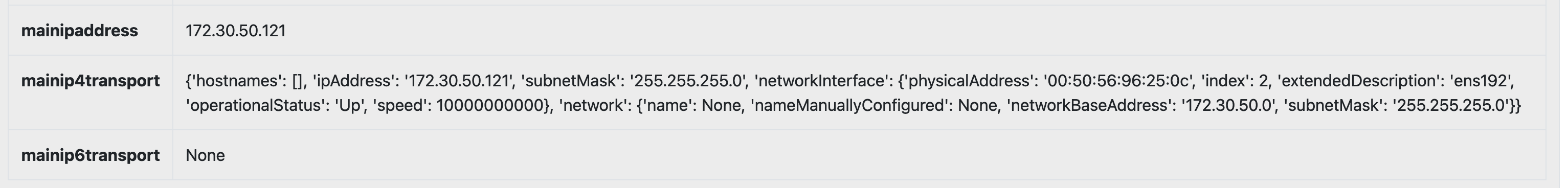 {'hostnames': [], 'ipAddress': '172.30.50.121', 'subnetMask': '255.255.255.0', 'networkInterface': {'physicalAddress': '00:50:56:96:25:0c', 'index': 2, 'extendedDescription': 'ens192', 'operationalStatus': 'Up', 'speed': 10000000000}, 'network': {'name': None, 'nameManuallyConfigured': None, 'networkBaseAddress': '172.30.50.0', 'subnetMask': '255.255.255.0'}}